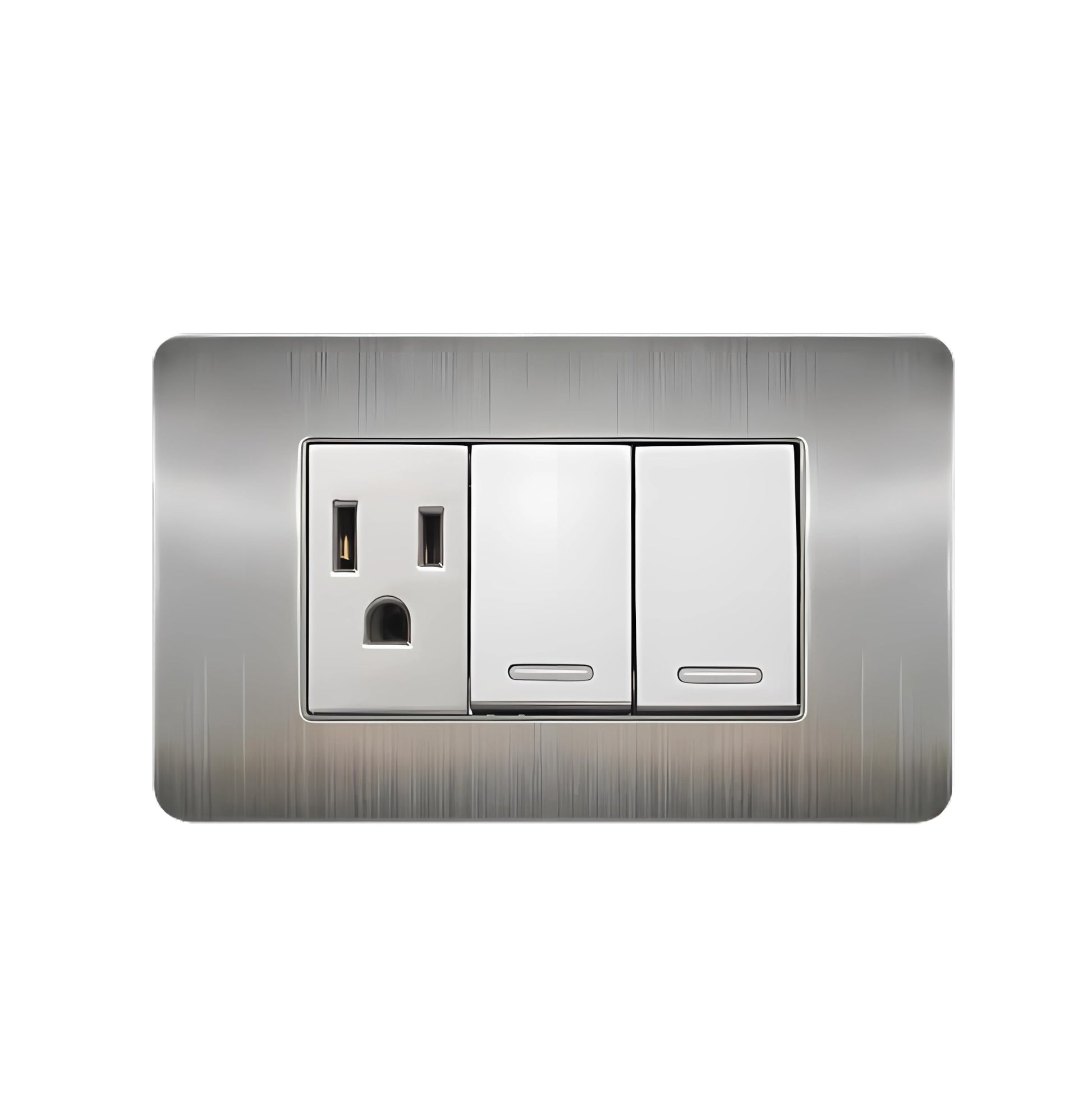 Argos Apagador Doble y Contacto 8841945 Con Placa De Acero Inoxidable Y Cuerpo De Policarbonato, Indicador luminoso LED, Para Interiores, 10 Ampers, 127 Volts, Linea Versalles, Satinado, Color Gris