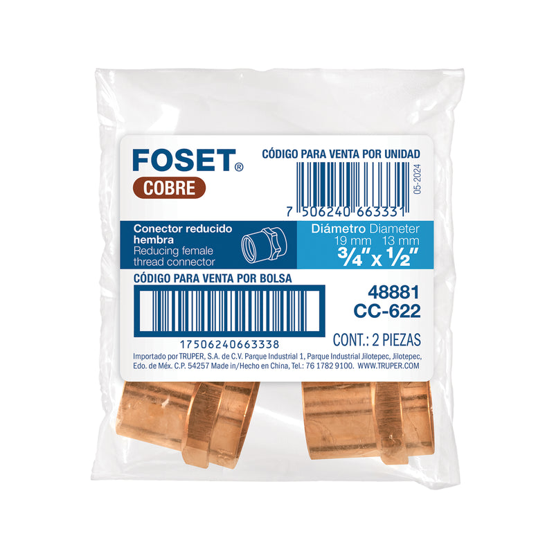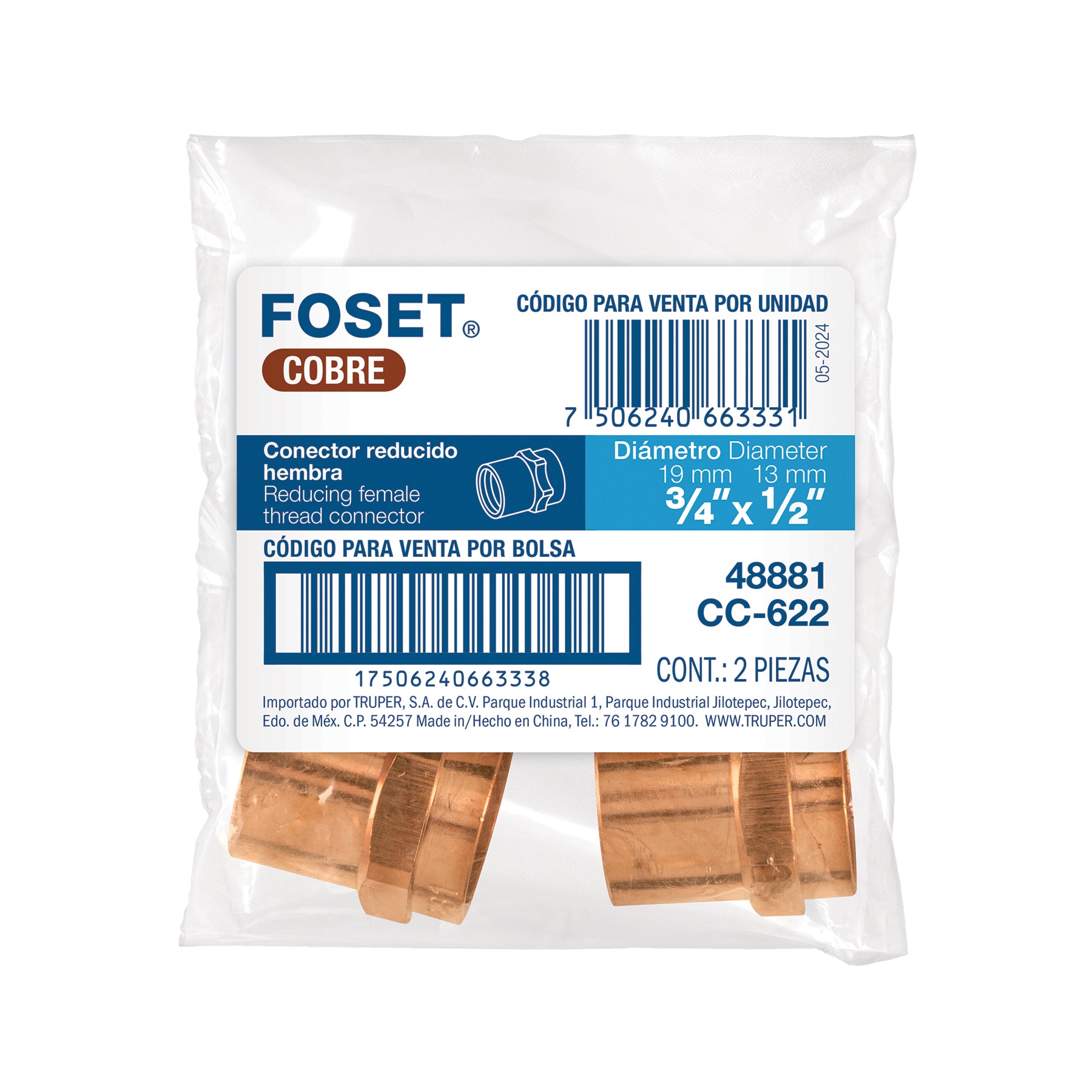 El conector hembra reducido 3/4x1/2' Foset es ideal para adaptaciones precisas en instalaciones hidráulicas. Fabricado con materiales resistentes, garantiza una conexión segura y duradera entre tuberías de diferentes diámetros, facilitando el flujo eficiente del agua y evitando fugas. Perfecto para trabajos profesionales que requieren calidad y confiabilidad en cada junta.