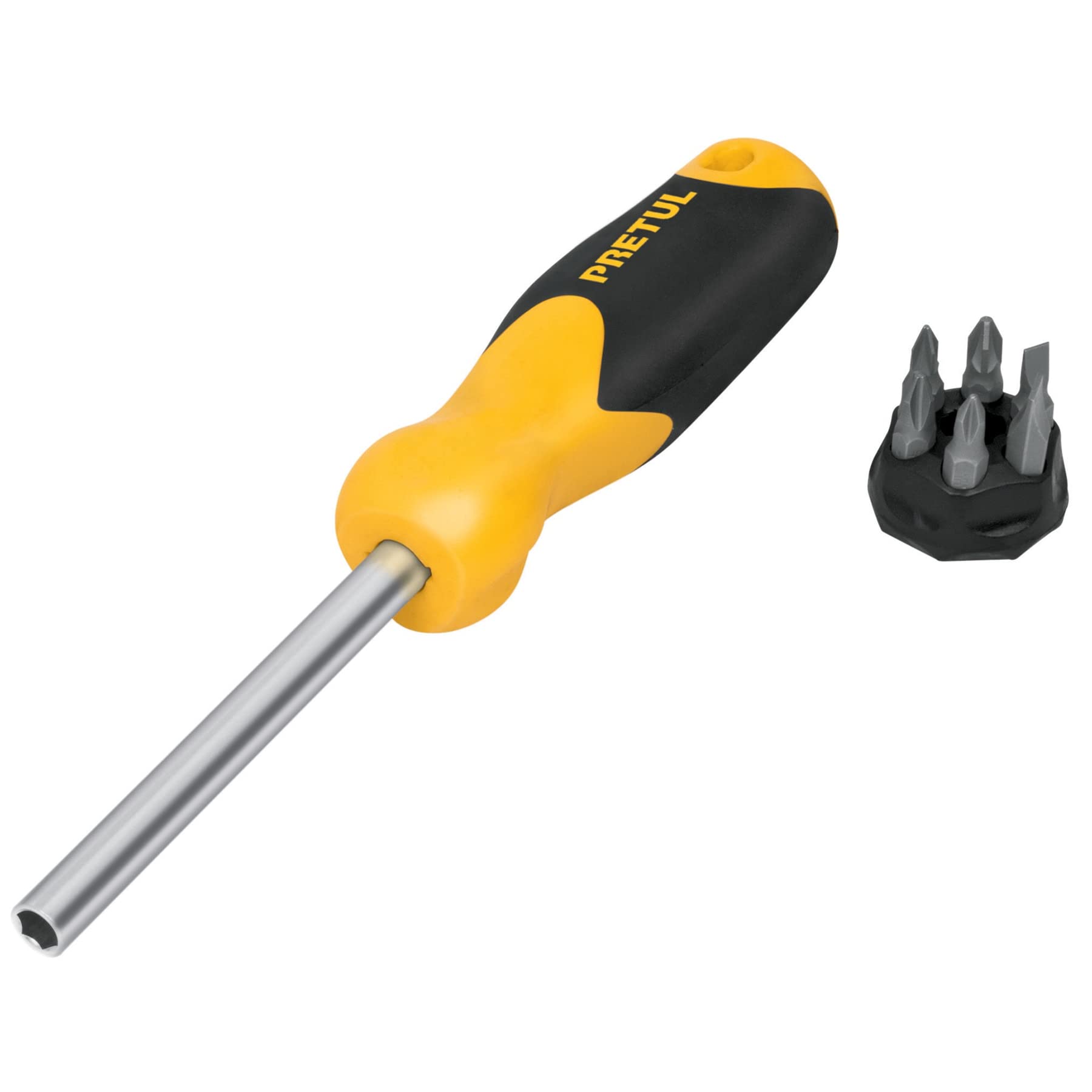 El desarmador Pretul DES-6P incluye seis puntas forjadas en acero al cromo vanadio, garantizando una alta resistencia y durabilidad para trabajos precisos y exigentes. Su diseño profesional ofrece un agarre cómodo y control óptimo, ideal para técnicos y aficionados que requieren herramientas confiables y de larga vida útil.