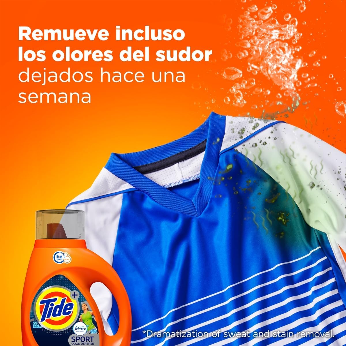 El detergente líquido Tide Sport es ideal para tu ropa deportiva. Ese jabón para ropas ofrece la limpieza increíble de Tide mientras cuida las fibras y combate los malos olores de la ropa de deporte. Pruébalo y disfruta de tu ropa blanca y de color limpia, sin manchas, sin mugre y sin malos olores. ¡Para la limpieza increíble que conoces y te encanta, existe solo un Tide!