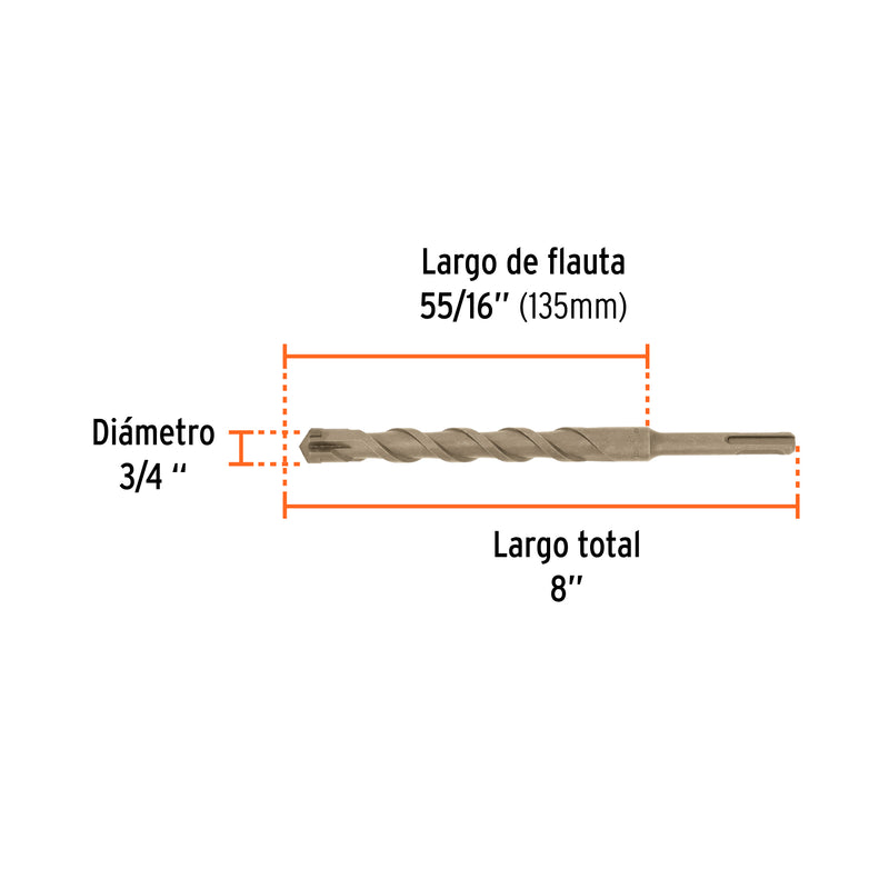 Truper BS-3/4X8, Broca para concreto con sistema directo de inserción (SDS Plus) 3/4″ x 8″