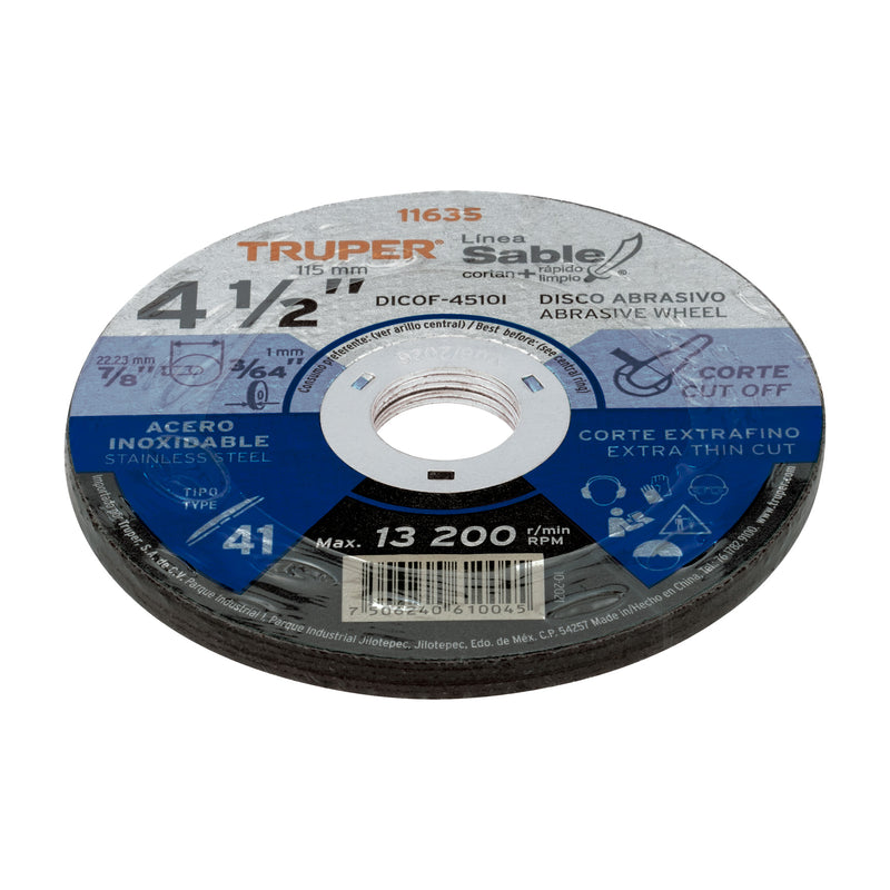 Truper DICOF-4510I, Disco Tipo 41 de 4-1/2″ x 1 mm corte fino acero inoxidable, Sable