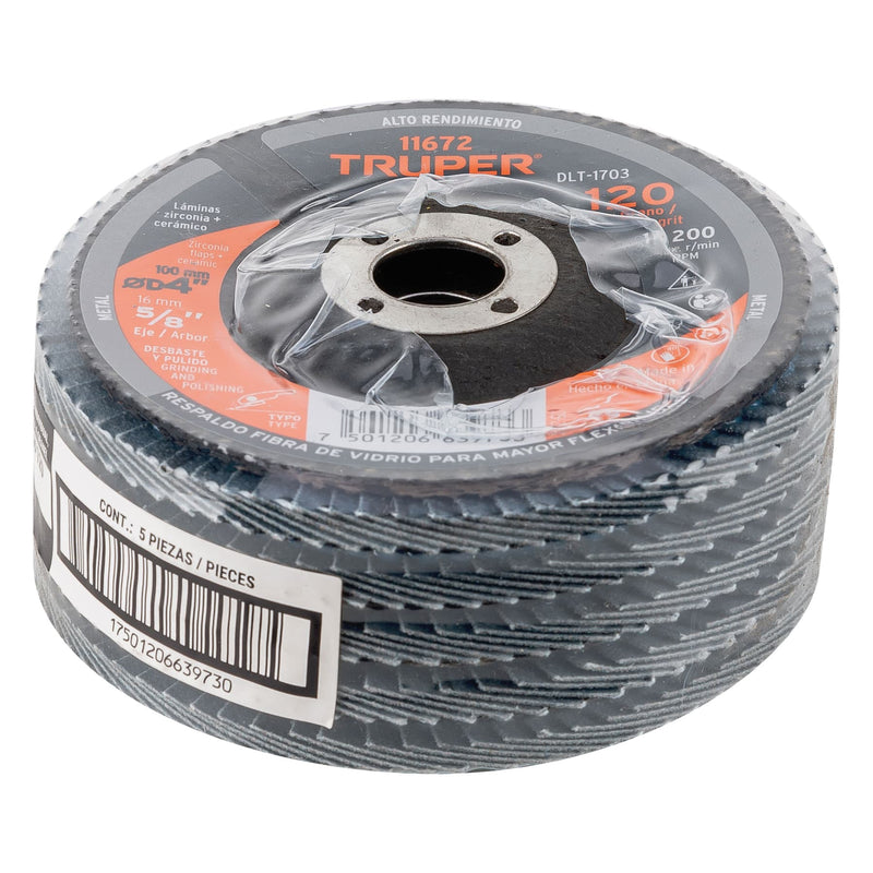 Truper DLT-1703, Disco laminado, alto rendimiento, diámetro 4″, 5/8″, grano 120