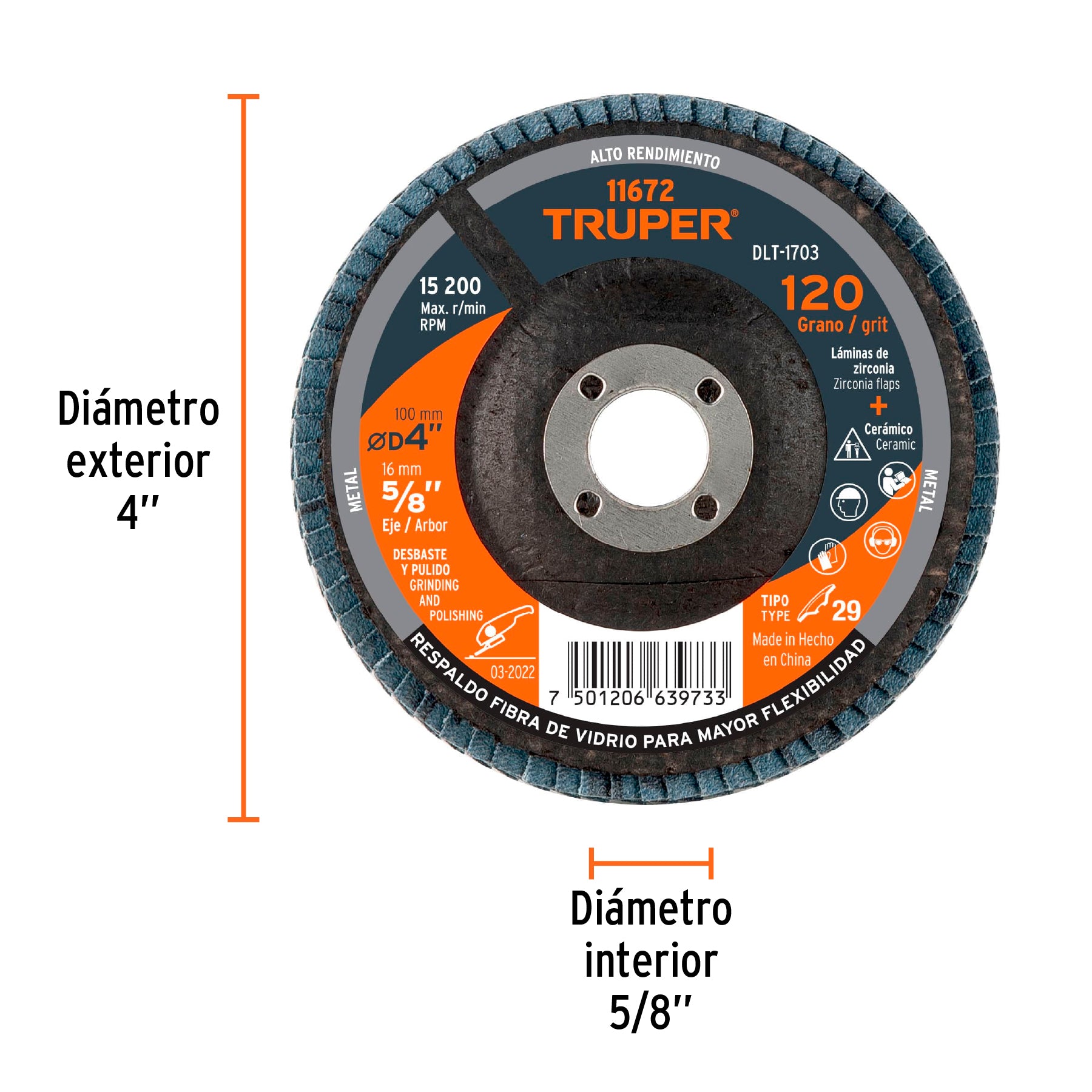 El disco laminado Truper DLT-1703, de alto rendimiento, ofrece un diámetro de 4″ y cuenta con un orificio de 5/8″ para un montaje seguro y preciso. Su grano 120 proporciona un acabado fino y eficiente en trabajos de desbaste y pulido, ideal para profesionales que requieren durabilidad y resultados óptimos en sus proyectos.