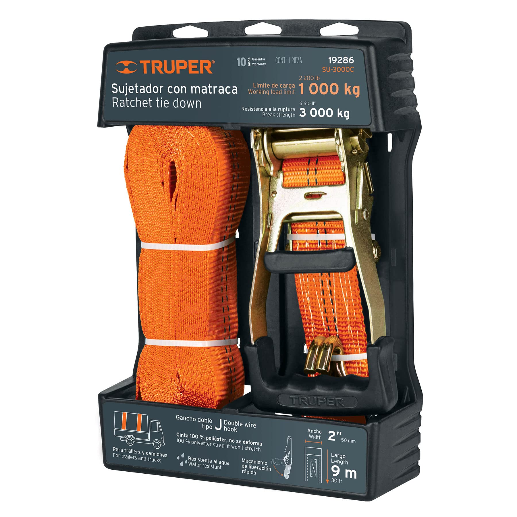 Los sujetadores con matraca Truper SU-3000C están diseñados para asegurar cargas de hasta 3000 kg, garantizando estabilidad y seguridad en el transporte. Fabricados con materiales resistentes, ofrecen un mecanismo de ajuste preciso que facilita la sujeción firme y confiable. Ideales para usos industriales y logísticos donde se requiere máxima capacidad y durabilidad.